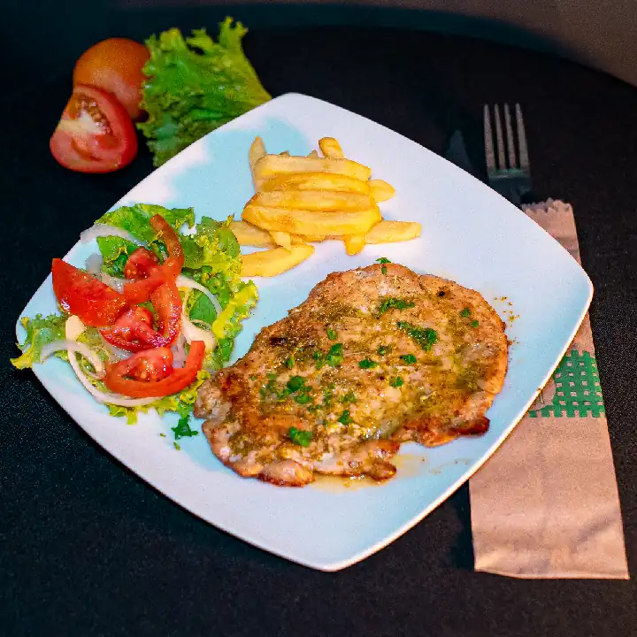 180 g De pechuga de campo ensalada mixta (lechuga, tomate, cebolla y vinagreta de guacamole) salsa artesanal (salsa de ajo de la casa) y papas a la francesa más dos limonadas artesanales granizadas.