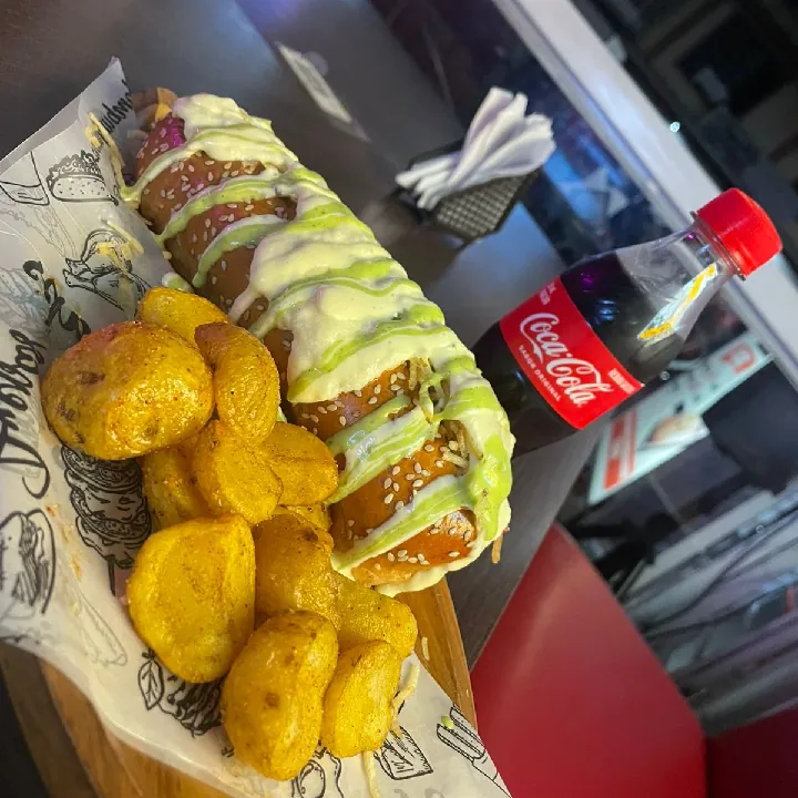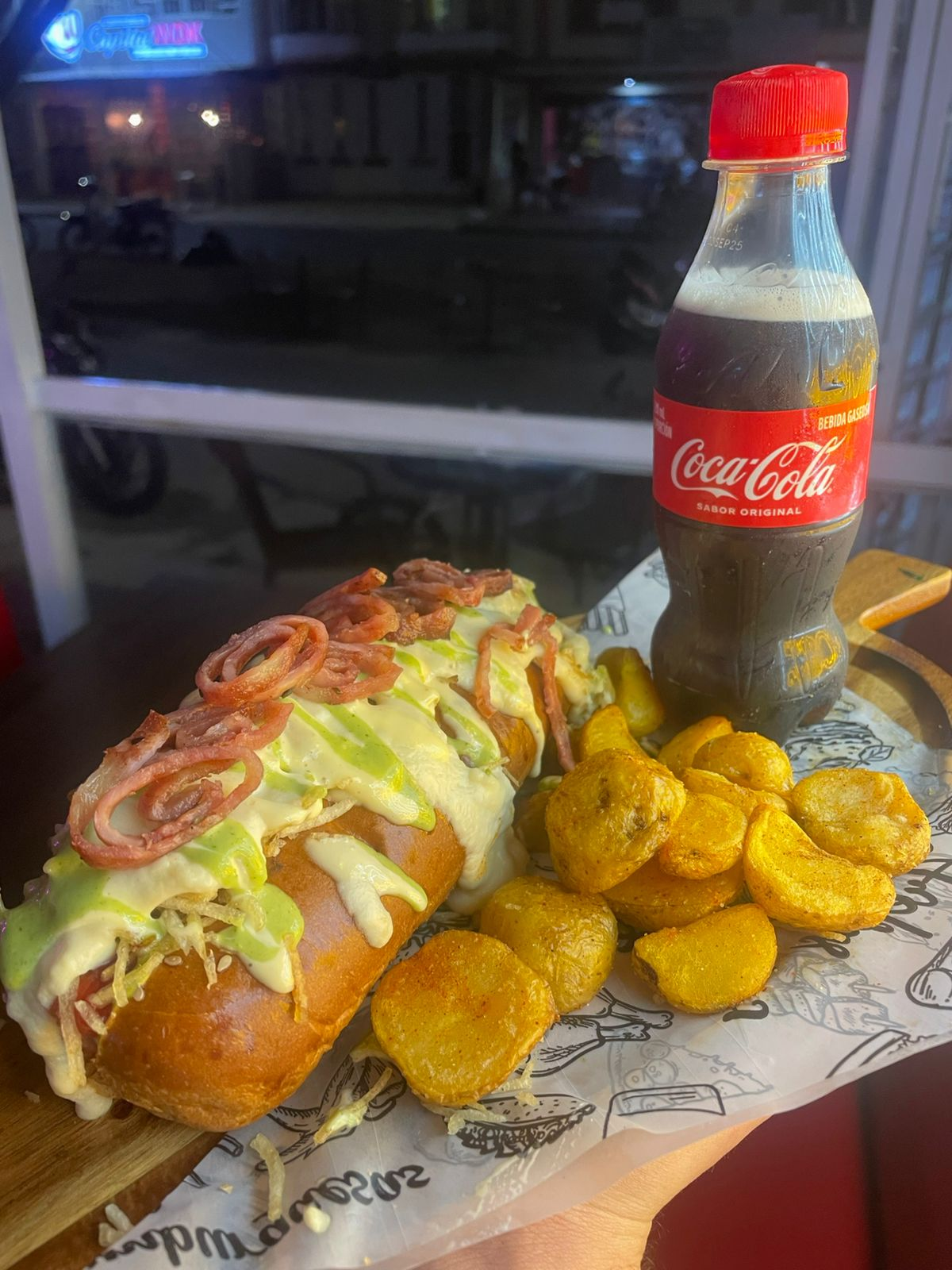 Pan perro, salchicha, cebolla caramelizada, salsas de la casa, ripio, queso y papitas criollas más coca cola 250 ml.