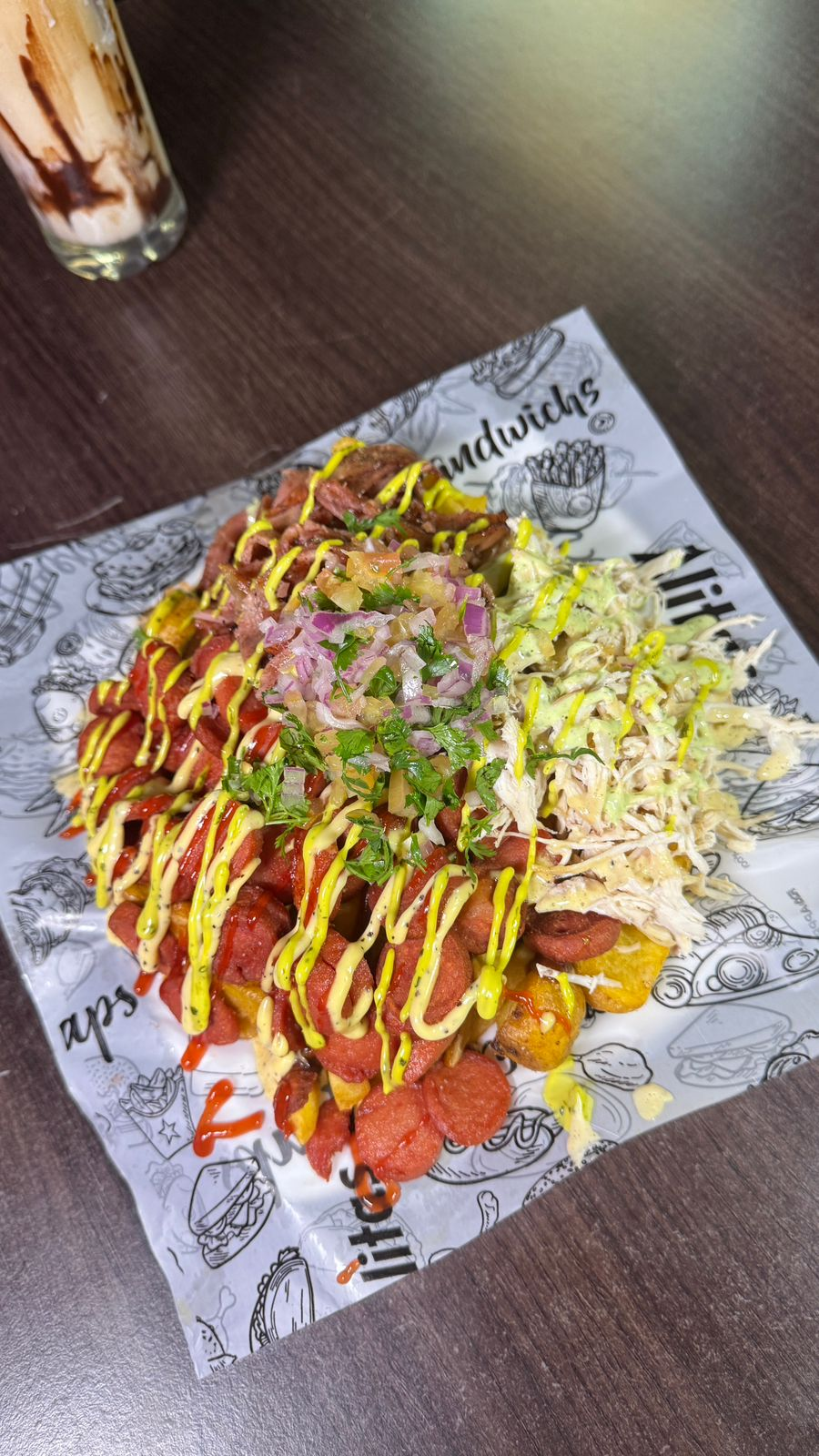Sándwich estilo cubano especial (pan francés, queso, jamón americano, pechuga, carne burger, piña caramelizada con salchipapa especial (papa amarilla 200 g, papa a la francesa 150 g, salchicha 150 g, pollo desmechado 40 g, tocineta, jamón, chorizo, queso, guacamole pico de gallo y salsas de la casa).