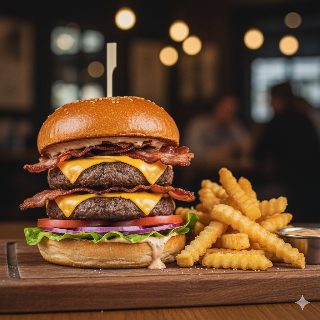 Pan brioche especial, 3 carnes de hamburguesas, tocineta doble queso verduras salsas de la casa papa a la francesa.