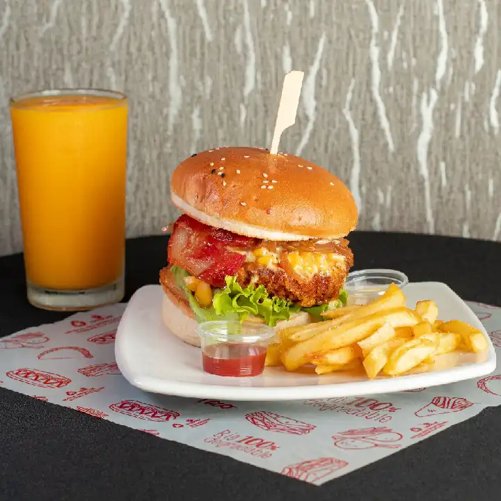 130 g De carne hamburguesa calidad angus, pollo crocante 120 g, queso, salsa de la casa y papas a la francesa.