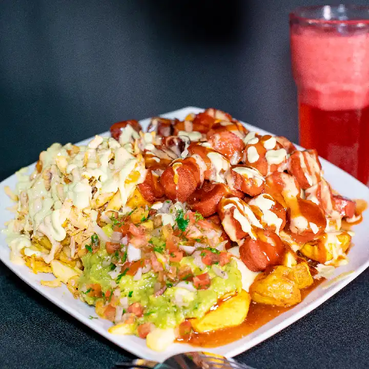 Papa amarilla 200 g, papa a la francesa 150 g, salchicha 150 g, pollo desmechado 40 g, tocineta, jamón, chorizo, queso, guacamole pico de gallo y salsas de la casa.