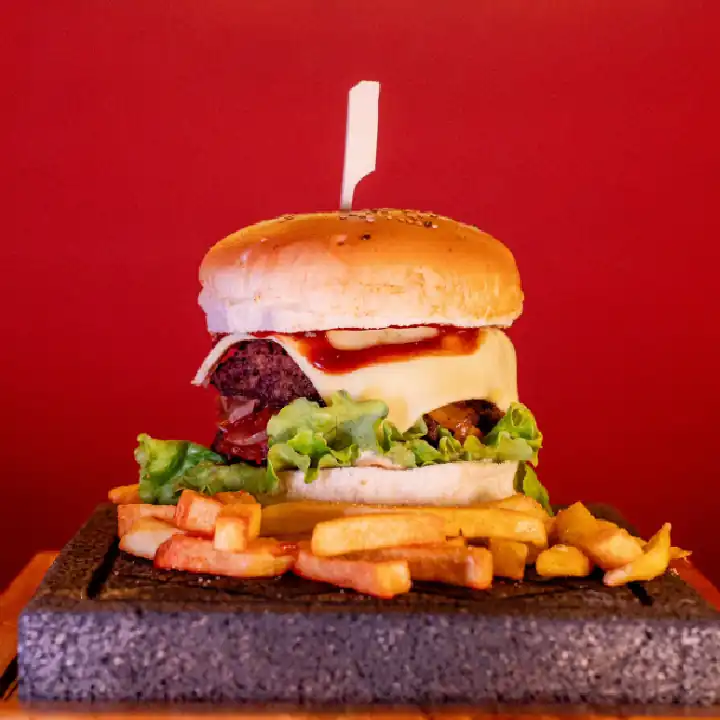 Pan brioche, carne burger, cebolla caramelizada, verduras, queso, salsa de la casa y papa a la francesa.