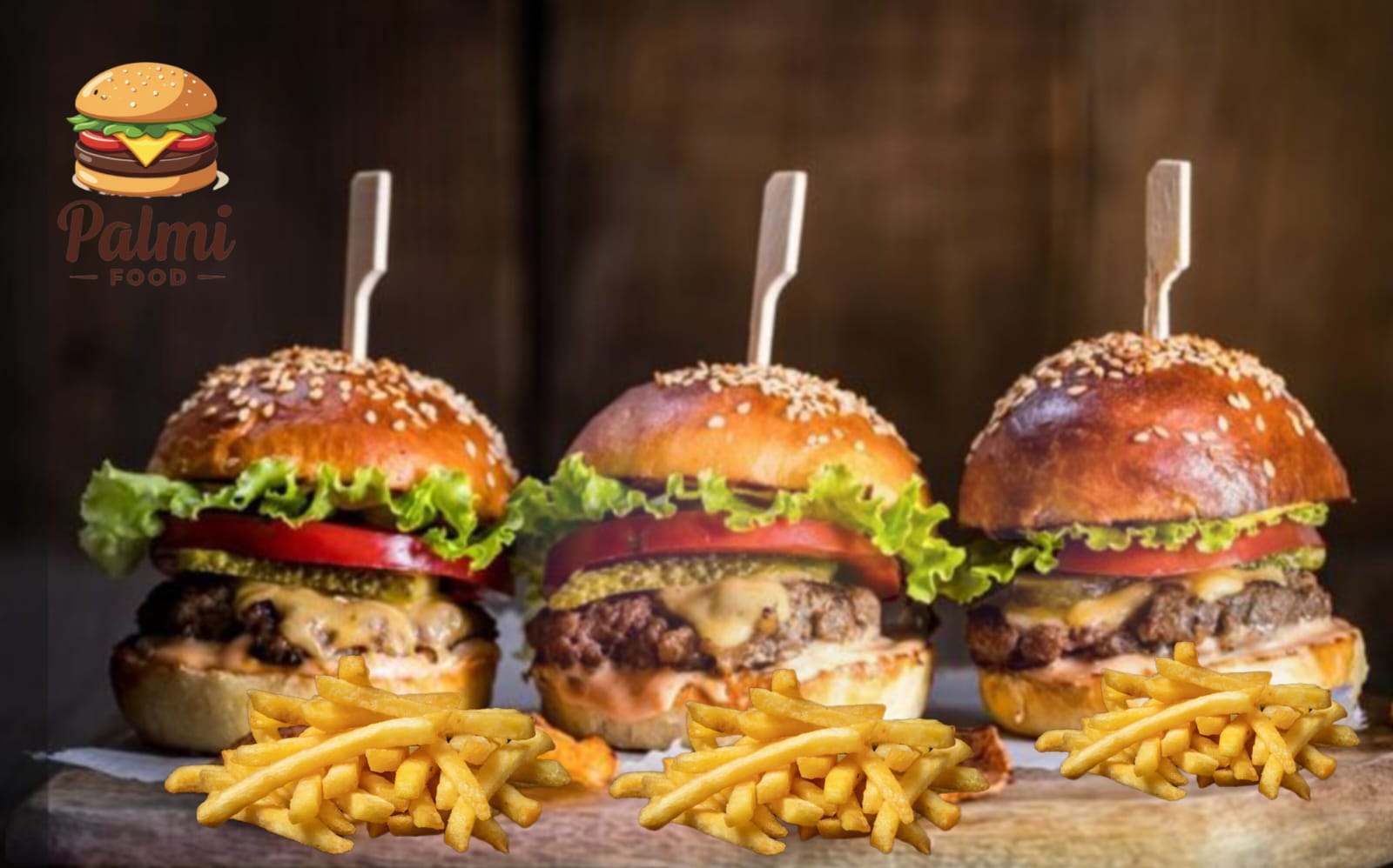3 Burger especiales (pan brioche, 130 g de carne hamburguesa, tocineta, jamón, cebolla, caramelizada verduras queso salsa de la casa) con 3 porciones de papas a la francesa.