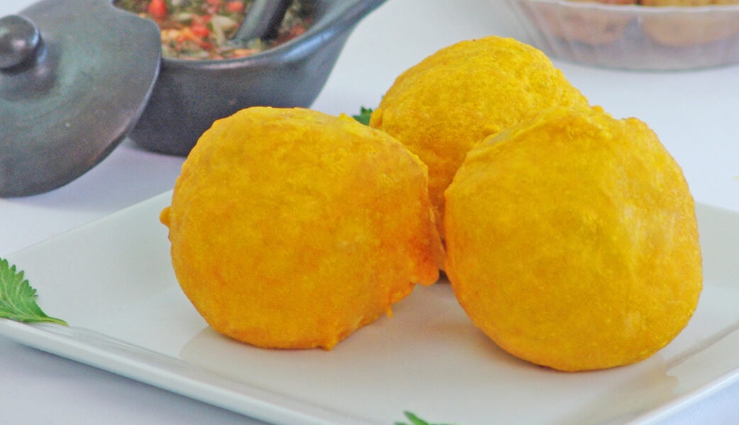 Papa frita en masa aborrajada con salchichón frito.