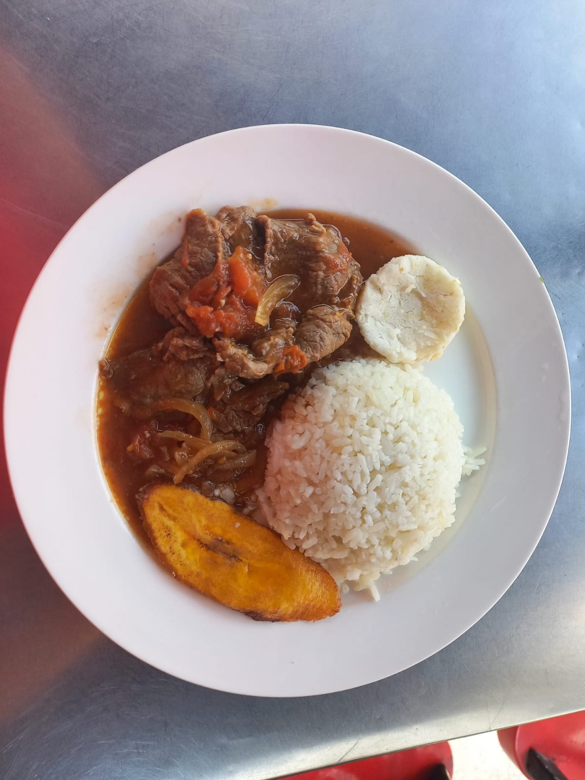 Carne en Bistec acompañado con tajada de maduro y arepa.