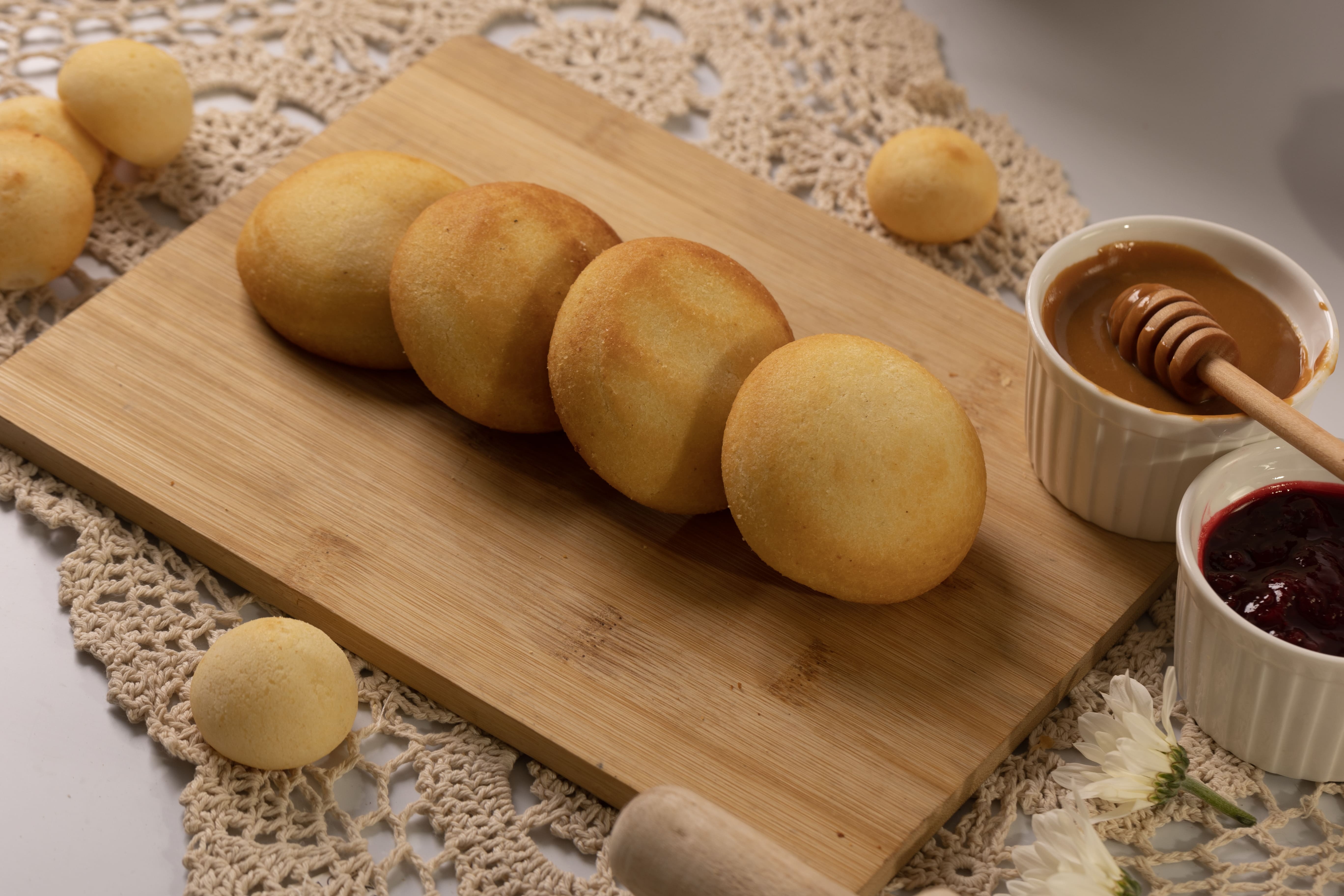 3 tradicionales pandebonos: crujiente por fuera y suave por dentro, elaborado con almidón, queso fresco y un toque de dulzura. Perfecto para acompañar con café o disfrutar a cualquier hora del día.