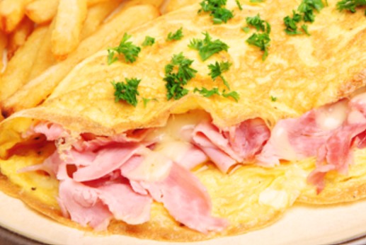 Omelette jamón y queso + porción de pan + bebida a elección.