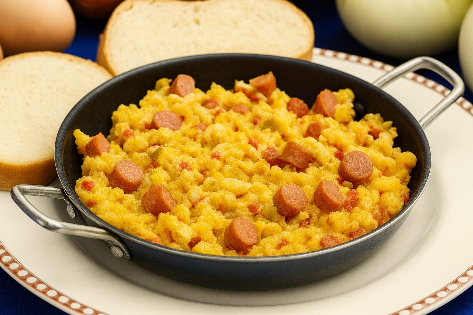 Deliciosos huevos revueltos con salchicha Ranchera, acompañados de pan y bebida a elección.