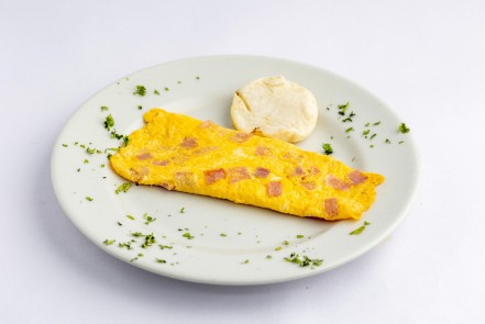 Omelette de huevos con jamon y queso mozzarella, acompañado de Pan o Arepa.