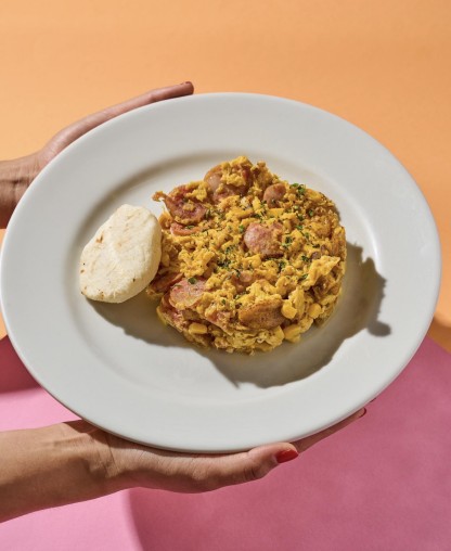 Huevos revueltos con chorizo, maíz, maduro y hogao, acompañado de Pan o Arepa.