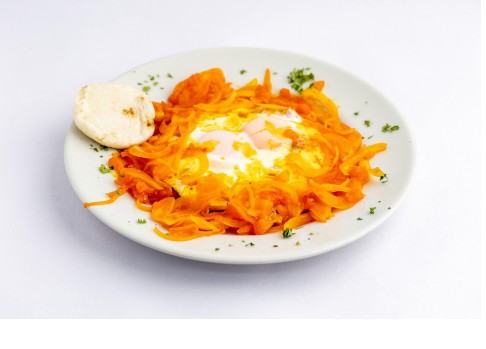 Huevos con chorizo de cerdo, cebollín, papa amarilla, tomate y queso mozzarella, acompañado de Pan o Arepa.