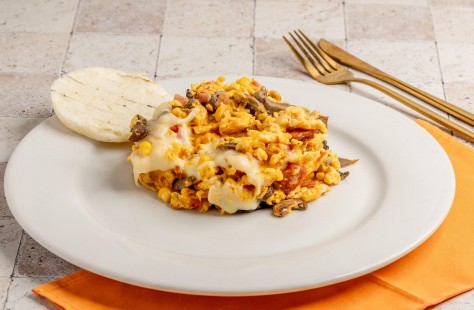 Huevos revueltos con jamón, tocineta, maíz, champiñones, salchicha y queso, acompañado de Pan o Arepa.