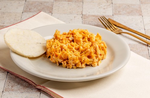 Huevos revueltos con mantequilla, acompañado de Pan o Arepa.