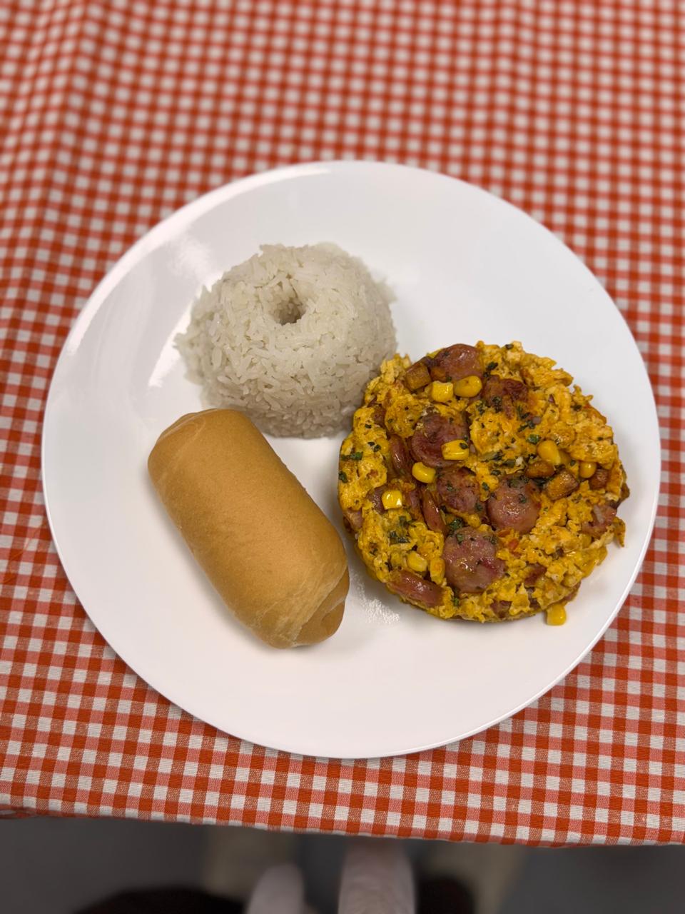 Huevos Colombianos (Huevos revueltos con chorizo, maíz, maduro y hogao) acompañados de porcion de Arroz + 1 Pan economico Montecarlo..
