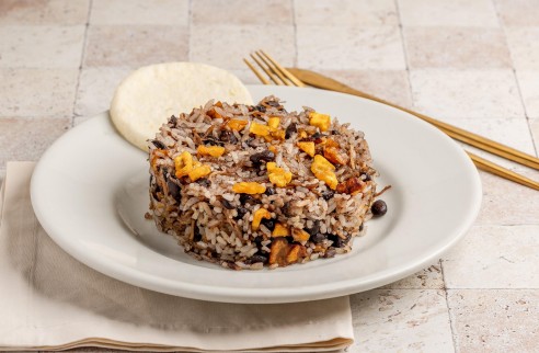 Calentado de arroz, carne, maduro y frijoles, acompañado de Pan o Arepa.