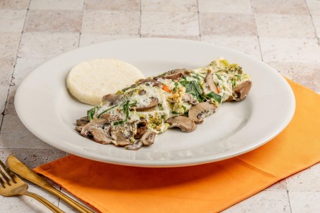 Omelette de claras de huevo con brócoli, espinaca, pimentón, aceite de oliva, champiñones, queso gruyere, acompañado de Pan o Arepa.
