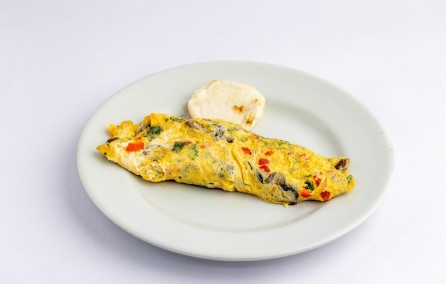 Omelette de huevos con tocineta, salchicha, jamón, maíz tierno, champiñones, queso mozzarella, acompañado de Pan o Arepa.