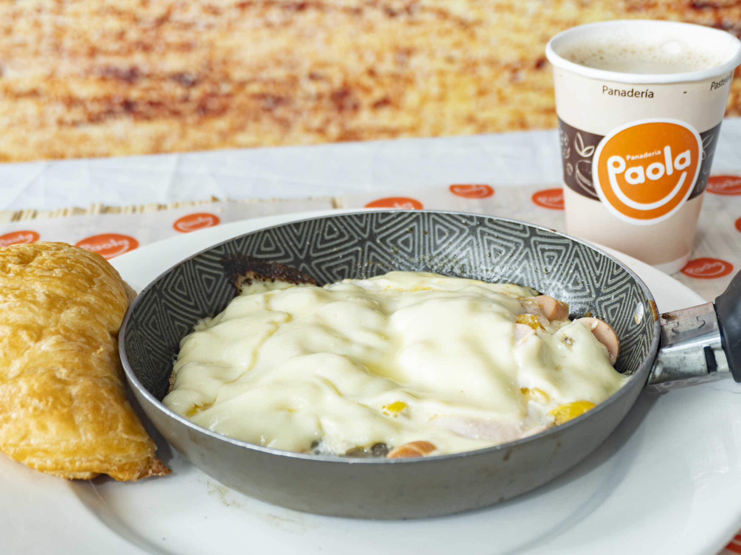 Desayuno con jamón, maíz tierno, pollo, tocineta, maduro, salchicha, champiñones y queso mozzarella.