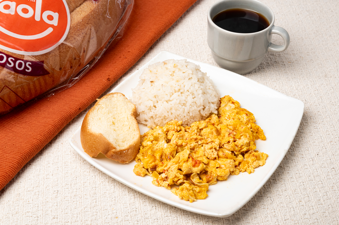 Huevos con guiso criollo (Cebolla y tomate) acompañados con arroz y pan.