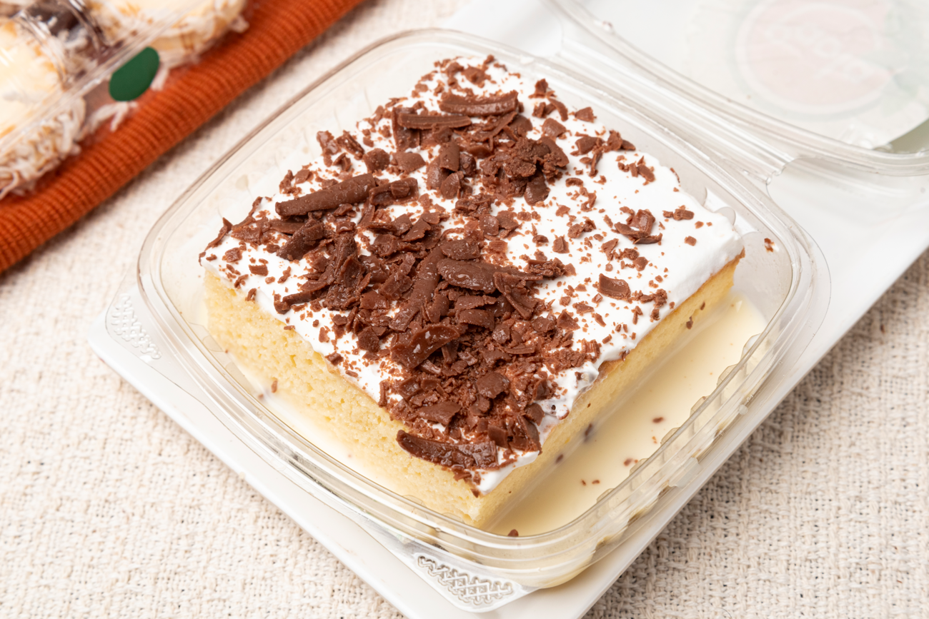 Torta tipo fría con leche condensada, crema de leche, leche común, cubierta de crema, porción personal.
