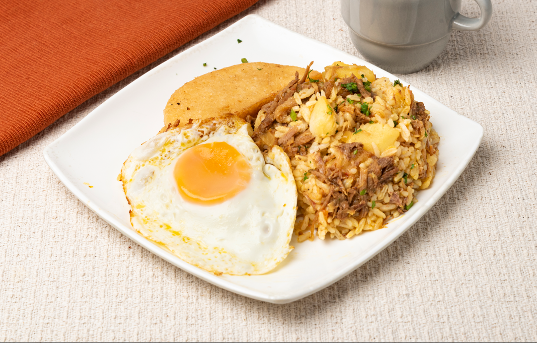 Deliciosa combinación de Arroz, papa, carne más arepa y huevo. Incluye 1 bebida que puede ser Café Negro, Café en Leche o Jugo del día o té frío para acompañar.