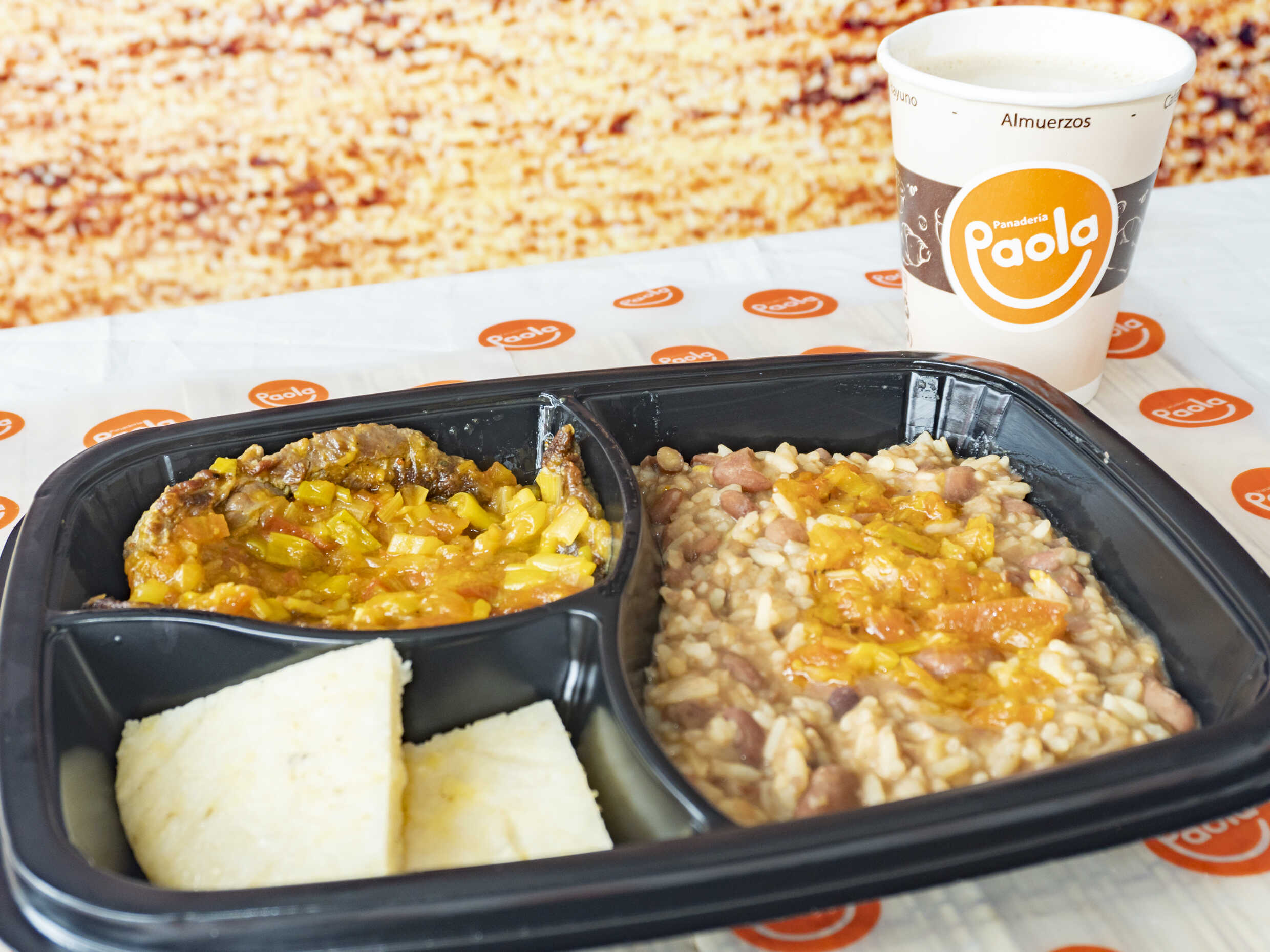 Calentado con arroz, frijoles, carne a elección, arepa y guiso.