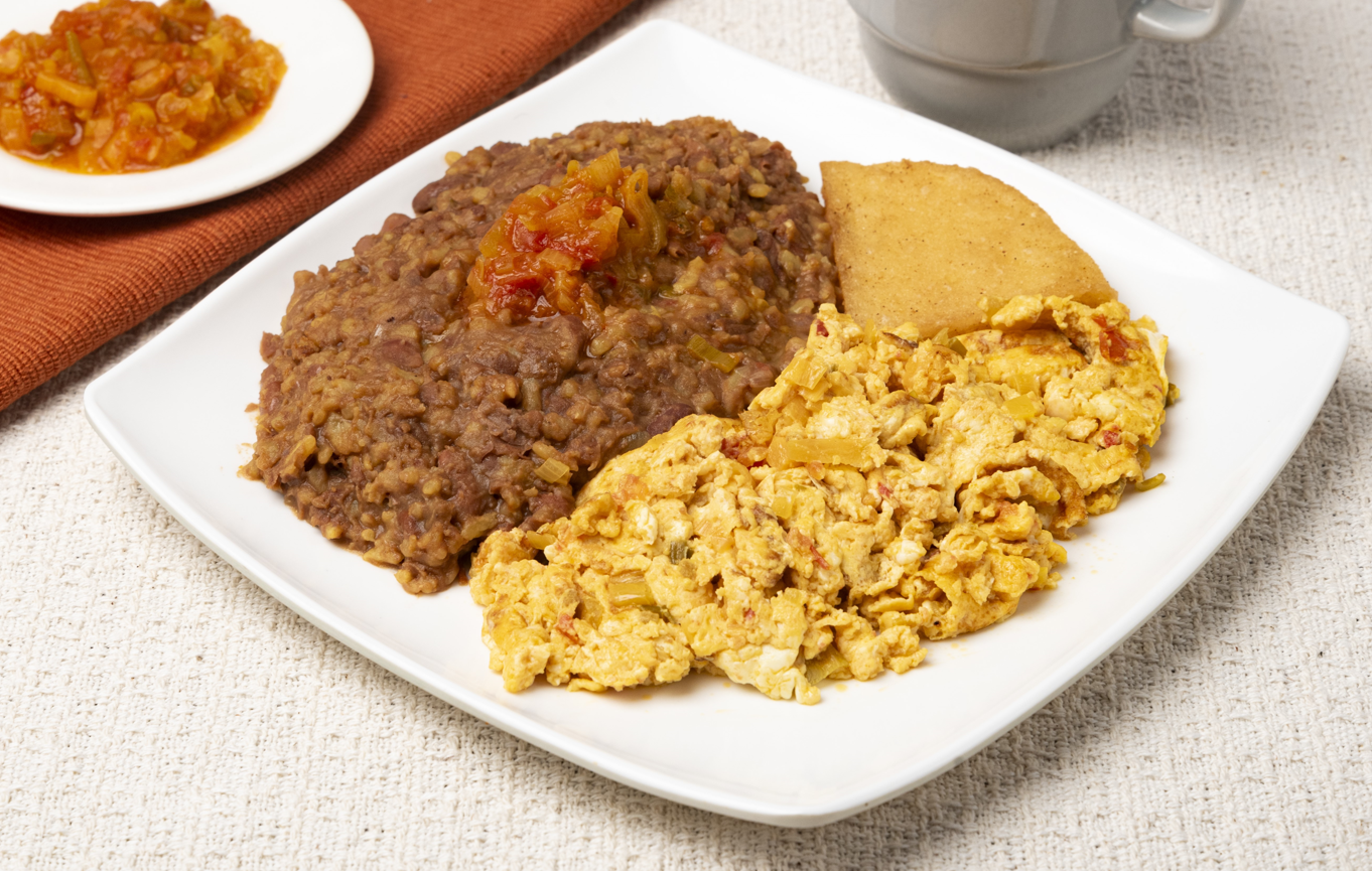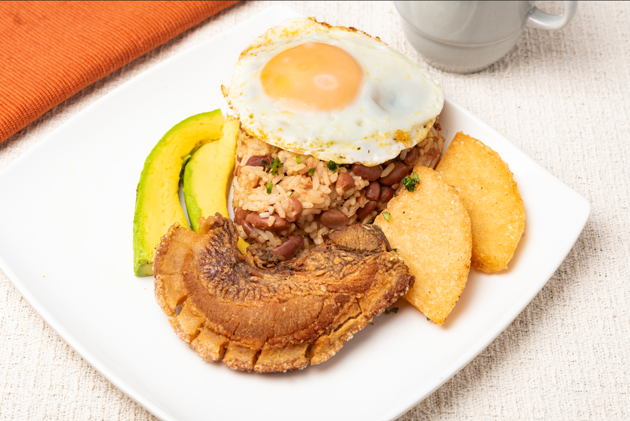 Deliciosa combinación de Arroz, frijoles, chicharron, aguacate más arepa y huevo. Incluye 1 bebida que puede ser Café Negro, Café en Leche, Jugo del día o té frío para acompañar.