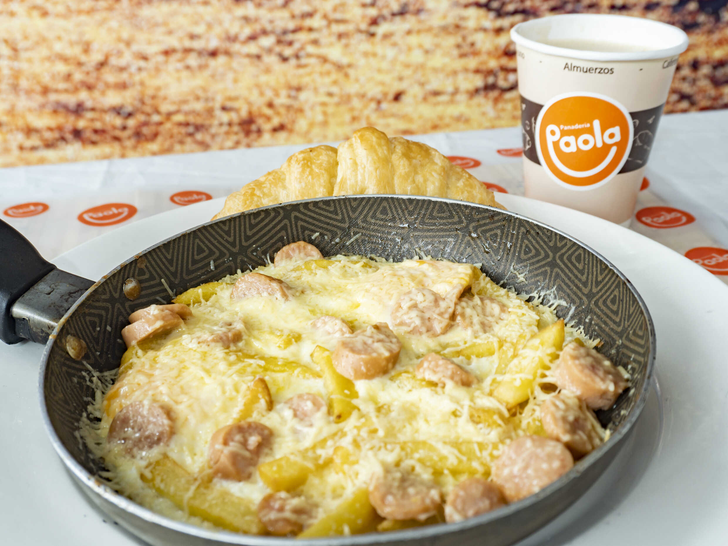 Huevos con papas a la francesa, salchicha y queso parmesano.