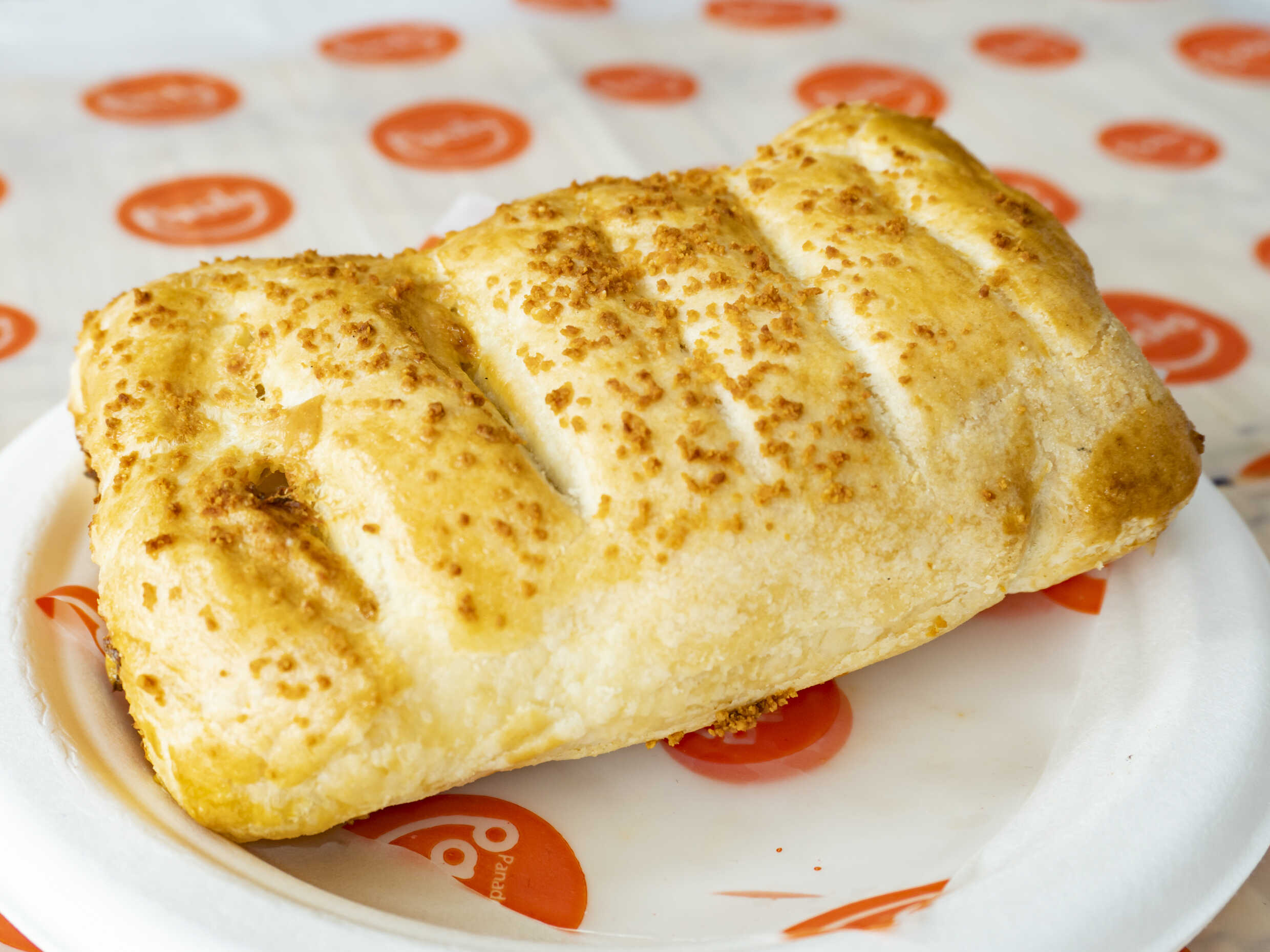 Pan Hojaldrado a Base de Masa de Hojaldre con Delicioso Guiso de Pollo. Acompañado de 1 Unidad de Jugo Natural del día en Botella Personal.