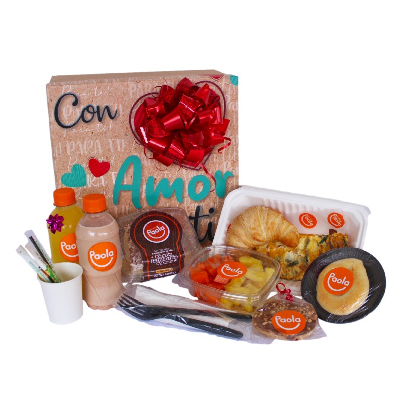Delicioso Omelette Samba (Maduro, Tocineta, Queso), Bebida Fría Botella (Jugo de Naranja), Bebida Caliente Botella (Cafe en Leche o Milo disponibilidad de la sucursal), Porción de Fruta (Piña-Papaya), Producto Queso (Pandebono), Yogurt más Cereal y Galleta Tipo Detalle; en una Caja de Cartón con Moño y Tarjeta.