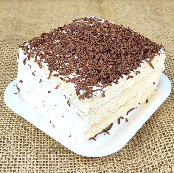 Bizcochuelo de vainilla remojado en las tres leches: leche entera, crema de leche y leche condensada.