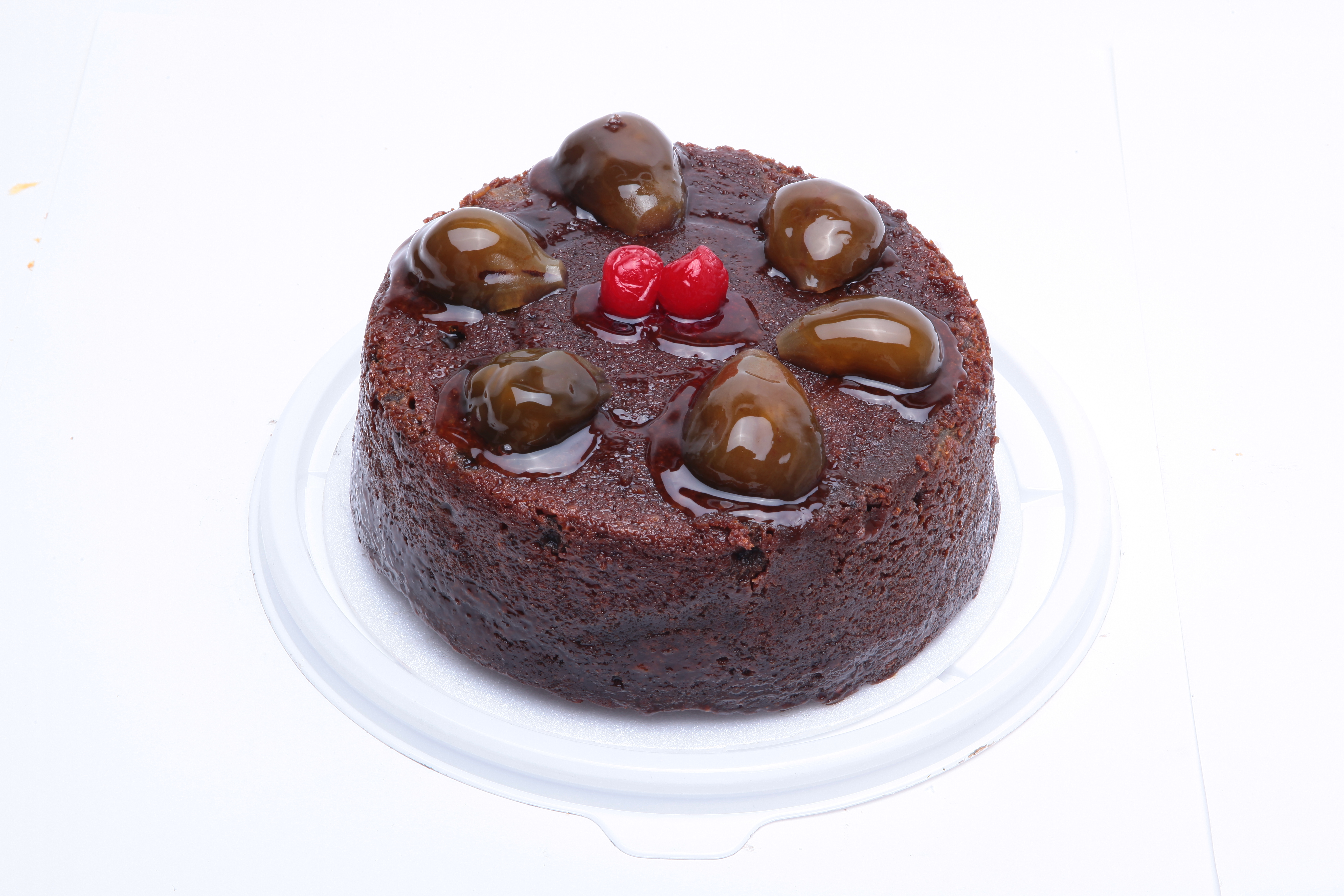Ponqué negro aliñado con pasas, nueces, coco, brevas y humedecida con vino