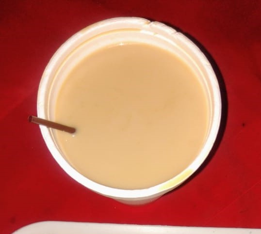 Un pandebono, un buñuelo y una almohabana con un café en leche de 8 onzas