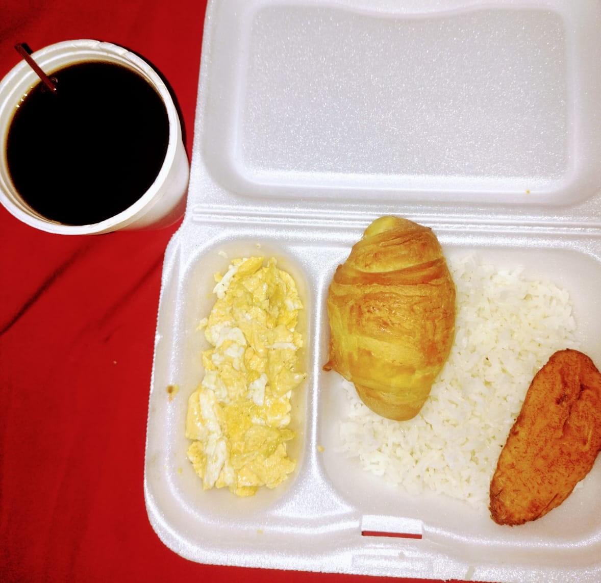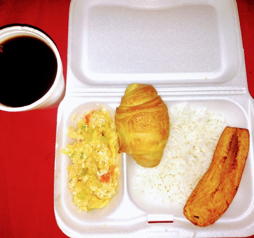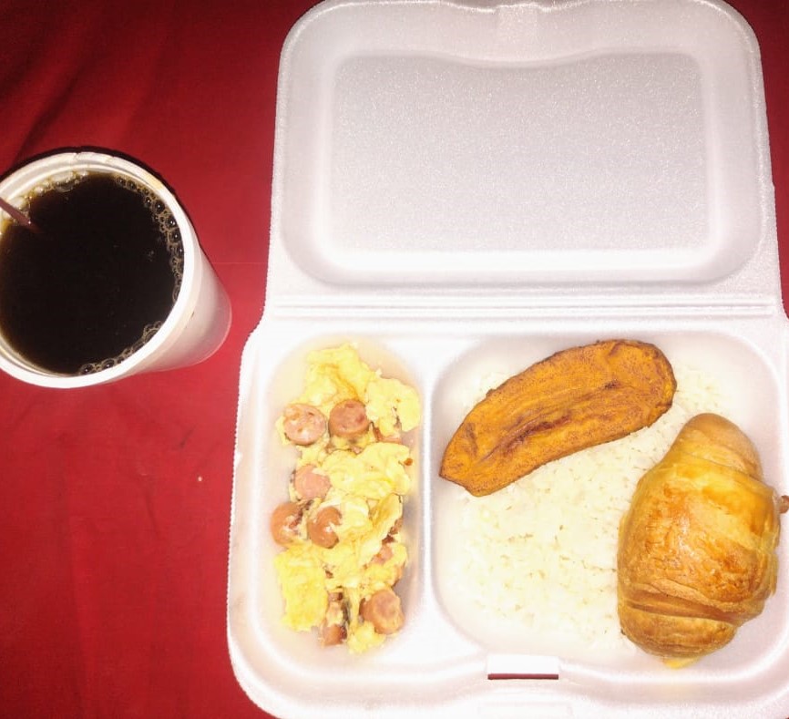 2 huevos revueltos, arroz blanco, tajada y pan. acompañado de bebida de 8 onzas a elección