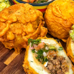 1 Papa rellena con arroz, papa, huevo y carne desmechada incluye salsas