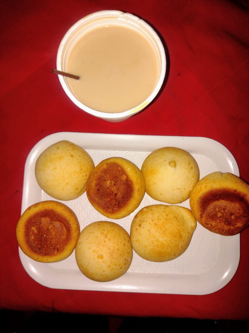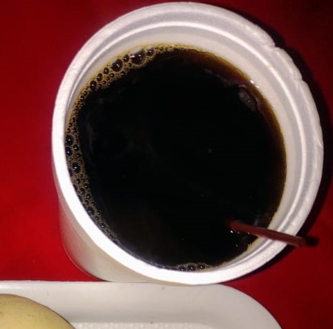 Un pandebono,un buñuelo y una almohabana con un café negro de 8 onzas