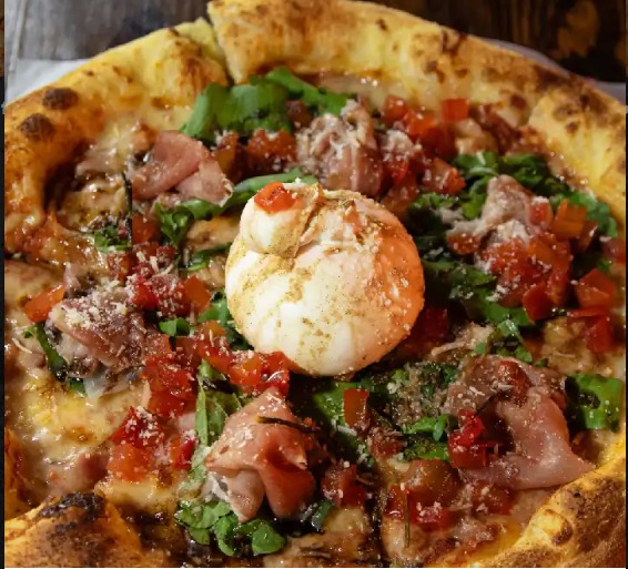 Rúgula, tomates dulces aromatizados en romero, burrata en el centro, jamón serrano y reducción de vinagre balsámico.