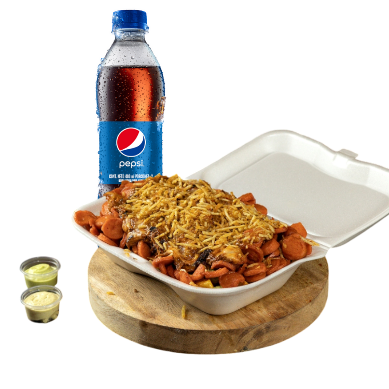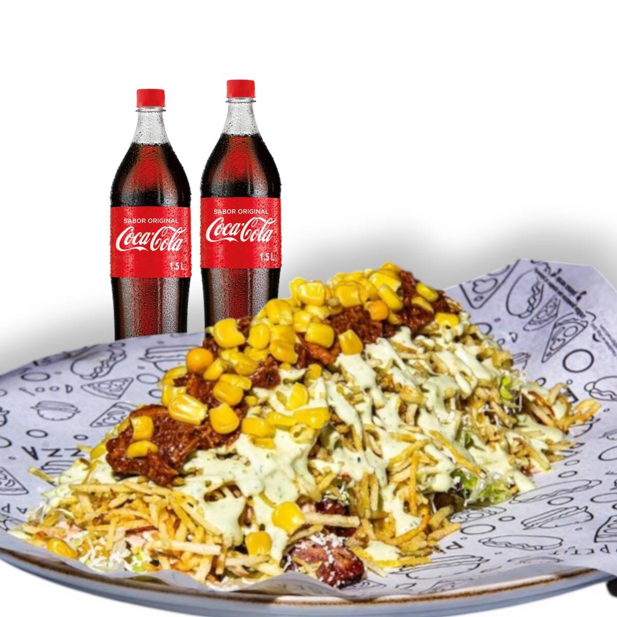 Papa, salchicha, queso gratinado, tocineta ahumada, madurito guayabo, maicitos, salsas, ripio de papa + 2 coca-cola pet 250ml