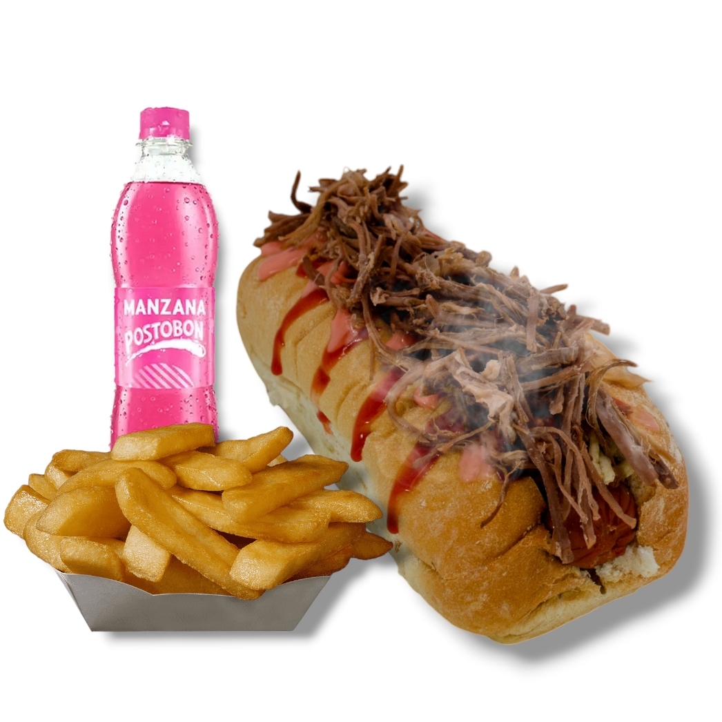 Pan artesanal, carne desmechada, tocineta ahumada, ripio de papa, salsas caseras + porción de papas + GRATIS jugo pet 250ml sabor a disponibilidad.