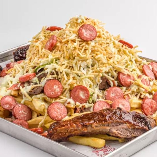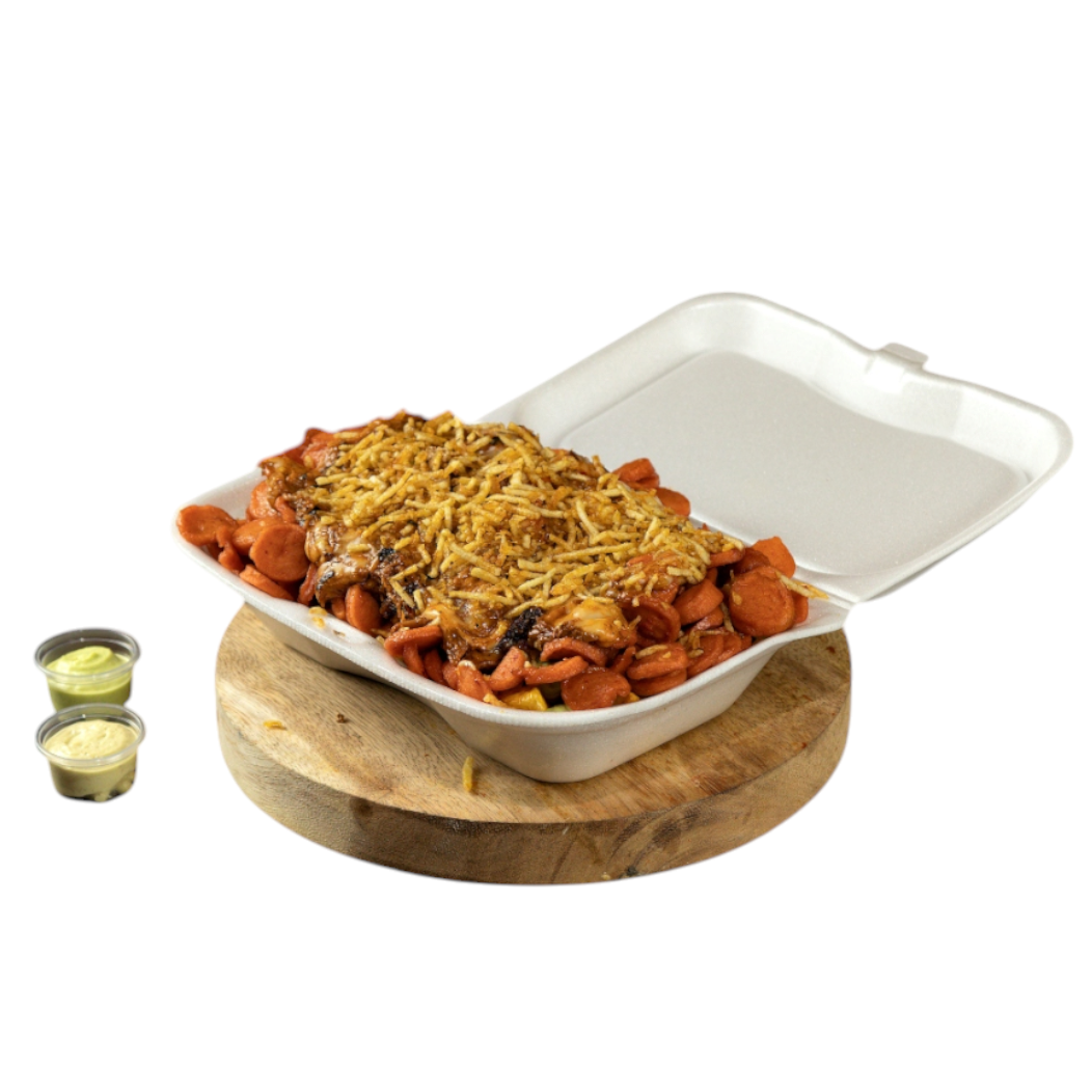 Papa, salchicha, salsas, queso gratinado, tocineta ahumada, salsas caseras y ripio de papa, ideal para 2 personas.