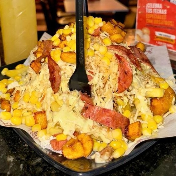 Papa, salchicha, queso gratinado, tocineta ahumada, maicitos tiernos, ripio de papa, salsas caseras.