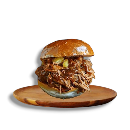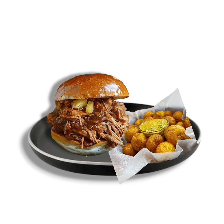 Pan artesanal, Pulled Pork en salsa sweed, tocineta ahumada, pure de maduro guayabo, ripio de papa.
