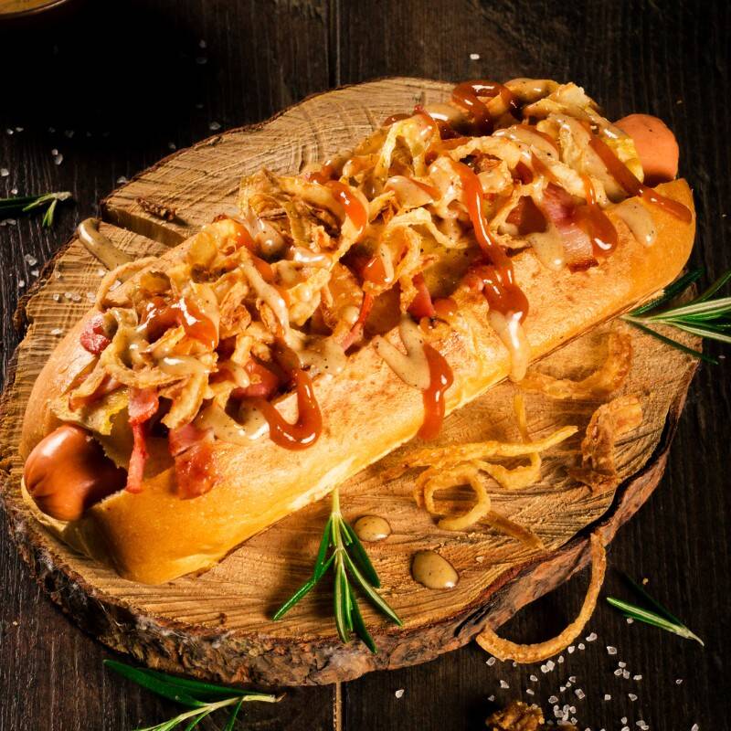 Perro caliente con Pan artesanal, salchicha americana, tocineta ahumada picada, ripio de papa, salsas de la casa.