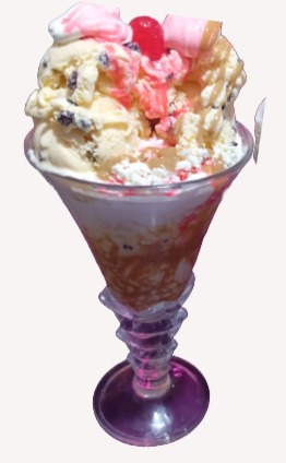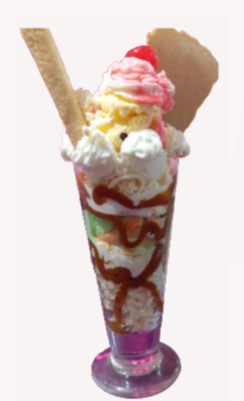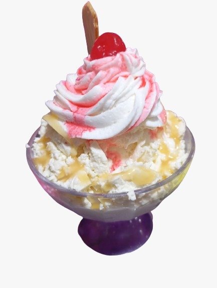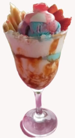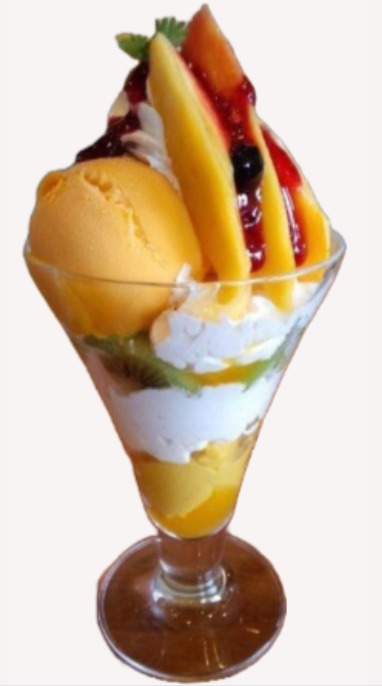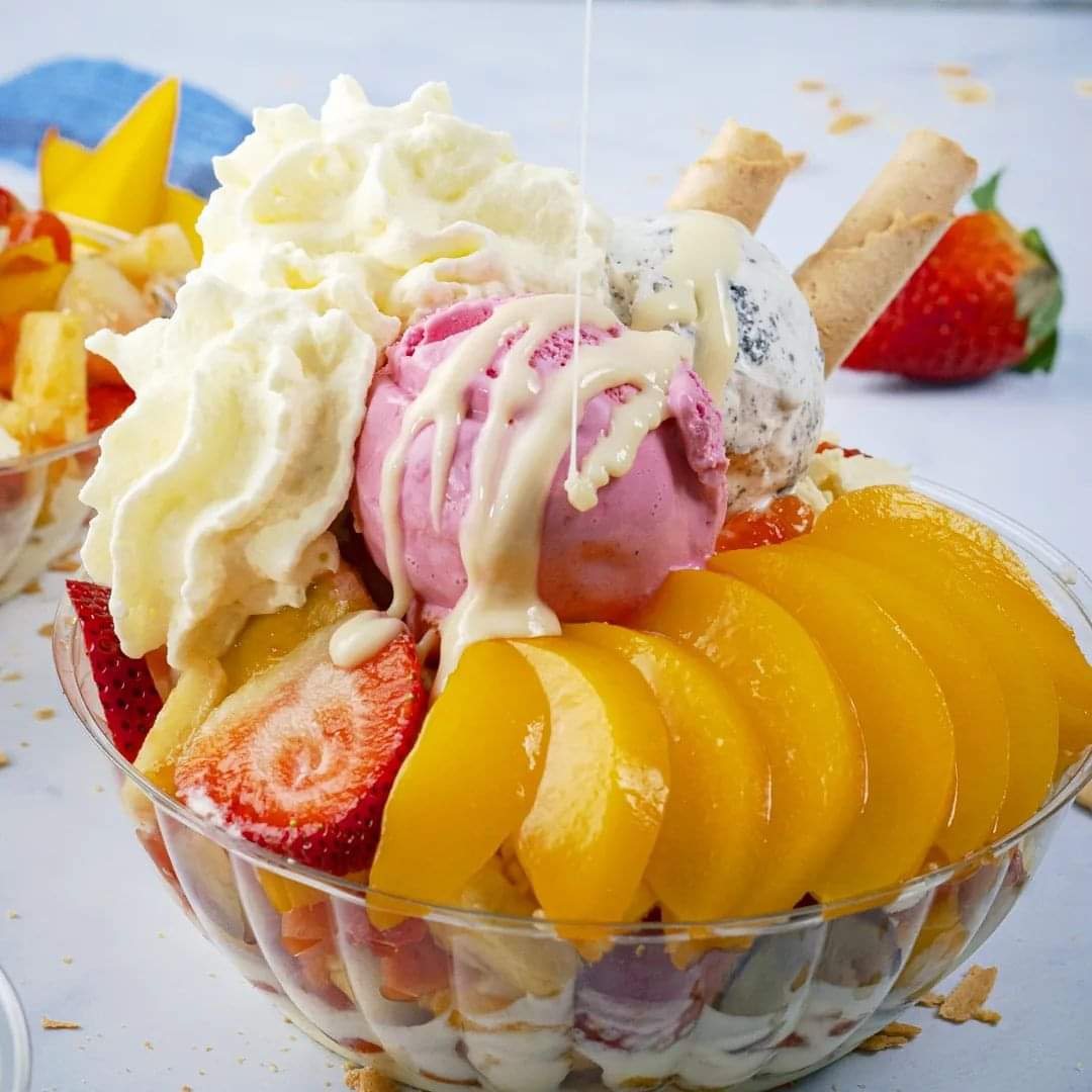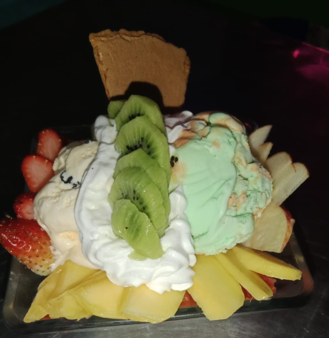 2 Bolas de helado, mango, kiwi, piña, crema chantilly, salsa al gusto, barquillo.