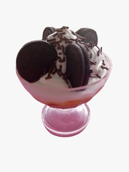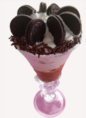 Salsa de chocolate, 1 bola de helado, crema chantilly, 4 galletas Oreo, oreo triturada, lluvia de chocolate.