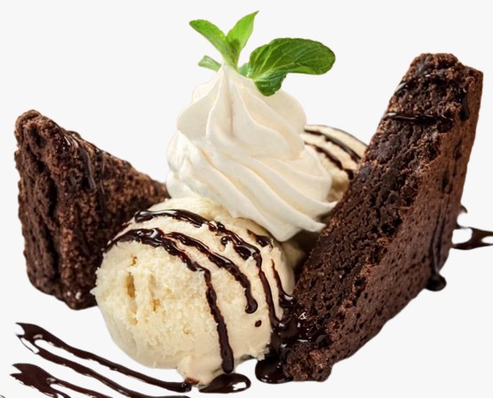 Dos brownies, dos bolas de helado, salsa de chocolate, crema chantilly.