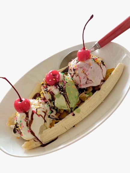Banano, tres bolas de helado, crema chantilly, cerezas, salsa al gusto.