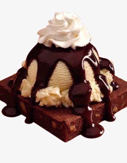 Brownie, una bola de helado, salsa de chocolate, crema chantilly.