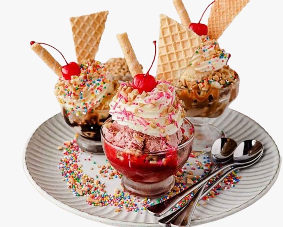 Salsa de frutos rojos, gelatina, crema chantilly, lluvia de colores, gomitas, bola de helado, galleta.